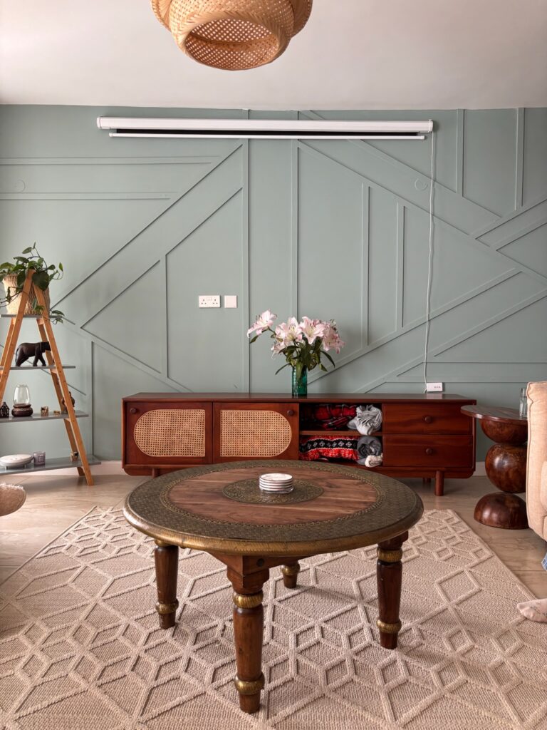 The color became the anchor around which the rest of the home took shape. You see it echoed throughout: in lamps, cushions, the dining set, and even on the mural wall where the painter blended it subtly into the geometric design. “It makes me feel calm,” she says.