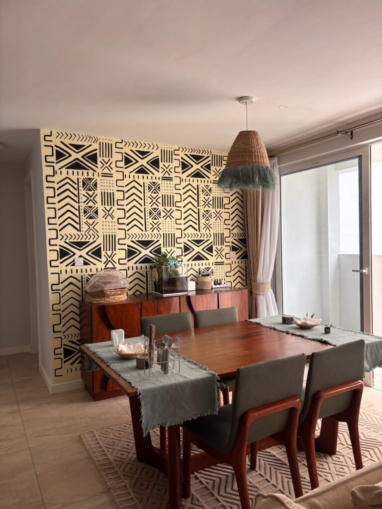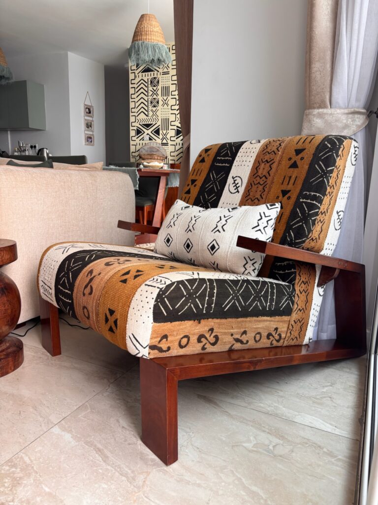 The Malian mudcloth is an unusual choice, not as ubiquitous as the kitenge fabric, and certainly not in mainstream use as furniture upholstery. Kagonya had wanted it for years but found sourcing it complicated. The Nairobi shops that stocked it were ridiculously overpriced and importing from West Africa came with uncertain timelines and high taxes.