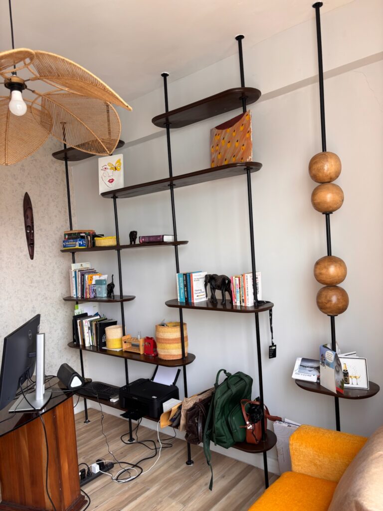 Since she owns her apartment, she has taken liberties when it comes to decorating it. In her office, for instance, she has an in-built bookshelf with metal rods anchoring it to the floor and ceiling, creating a bespoke piece that delivers in form and function.