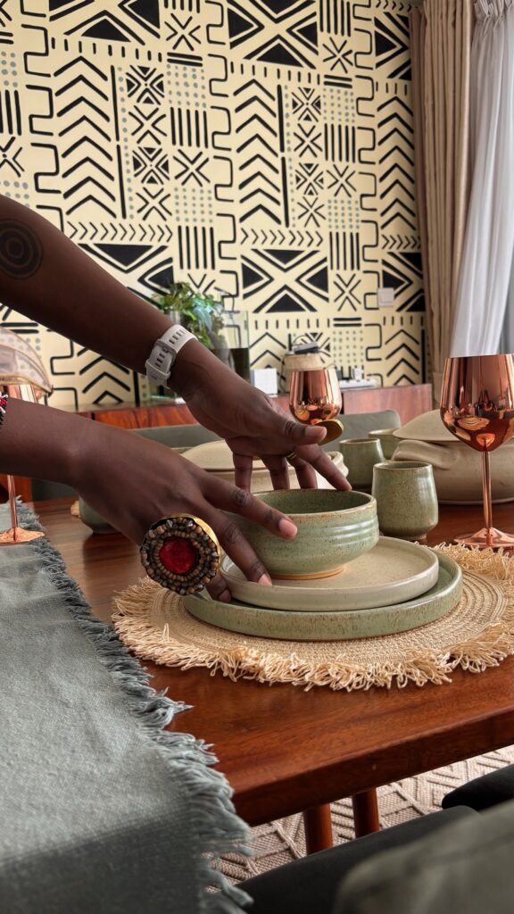 The mudcloth, handmade and thick with texture and dazzling with intricate patterns, carries history in every line. “When you touch it, you feel a story,” she says. This is why she chose it over mass‑produced wax prints. Authenticity matters.